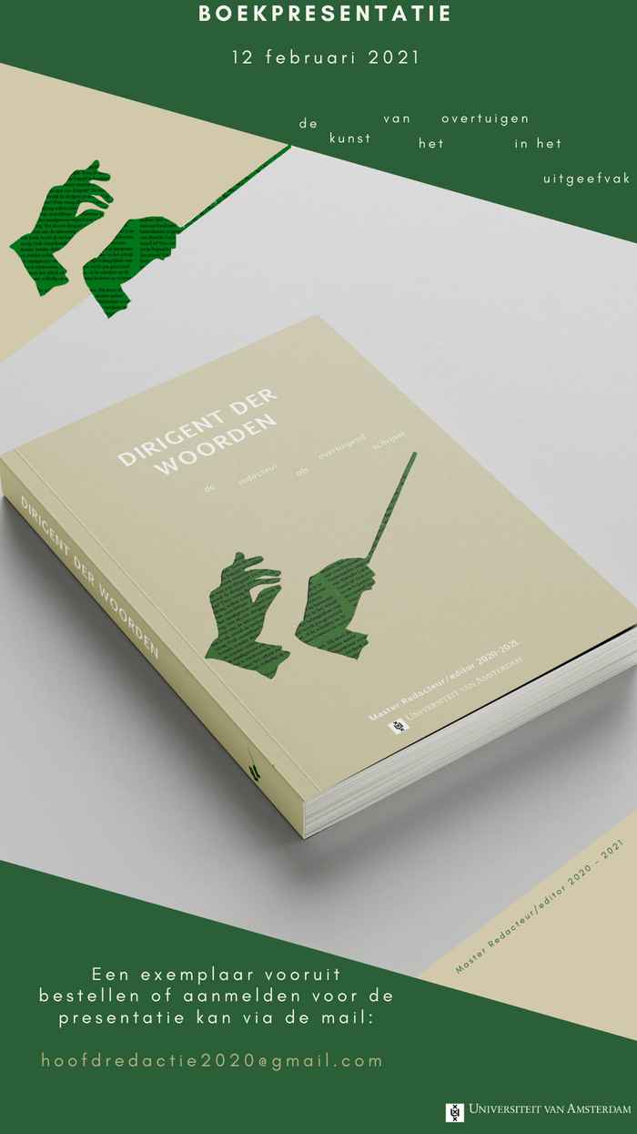 De studenten maakten het boek Dirigent der woorden als onderdeel van het vak Taalanalyse en tekstredactie. In duo’s schreven ze hoofdstukken over verschillende aspecten van retoriek in het boekenvak. Hoe schrijf je als uitgever bijvoorbeeld persberichten voor verschillende typen media, van traditionele kranten tot ‘bookstagrams’? Hoe krijg je buitenlandse uitgeverijen zo ver dat ze een boek van een Nederlandse auteur aankopen? En hoe overtuig je mensen ervan dat het belangrijk is een omstreden boek als Mein Kampf opnieuw uit te brengen?