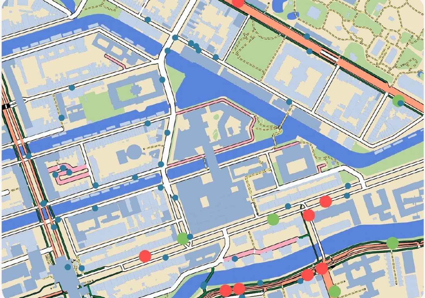 We maakten een model van het gebied tussen Waterlooplein en Oosterpark. Elke stip in de simulatie was iemand: rood voor auto’s, blauw voor voetgangers, groen voor fietsers. We gebruikten A/B Street (open software), maar bouwden ons eigen model erin.